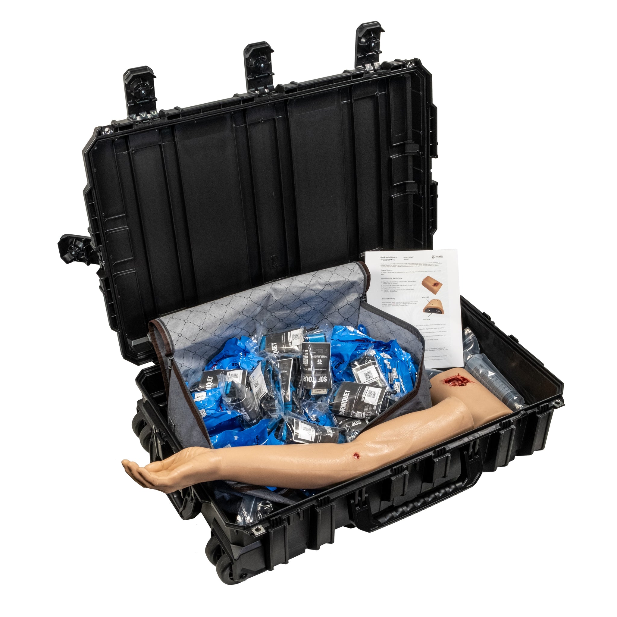 The TacMed™ Skills Trainer Kit provides medical instructors and educational institutions a complete, high-quality solution for immersive bleeding control training. It includes the TacMed™ Tourniquet Task Trainer Arm, Packable Wound Trainer, 20 SOF® Tourniquets, 20 OLAES® Training Bandages, the Blood Fill System, and instructions - everything you need to practice and teach life-saving hemorrhage control skills.